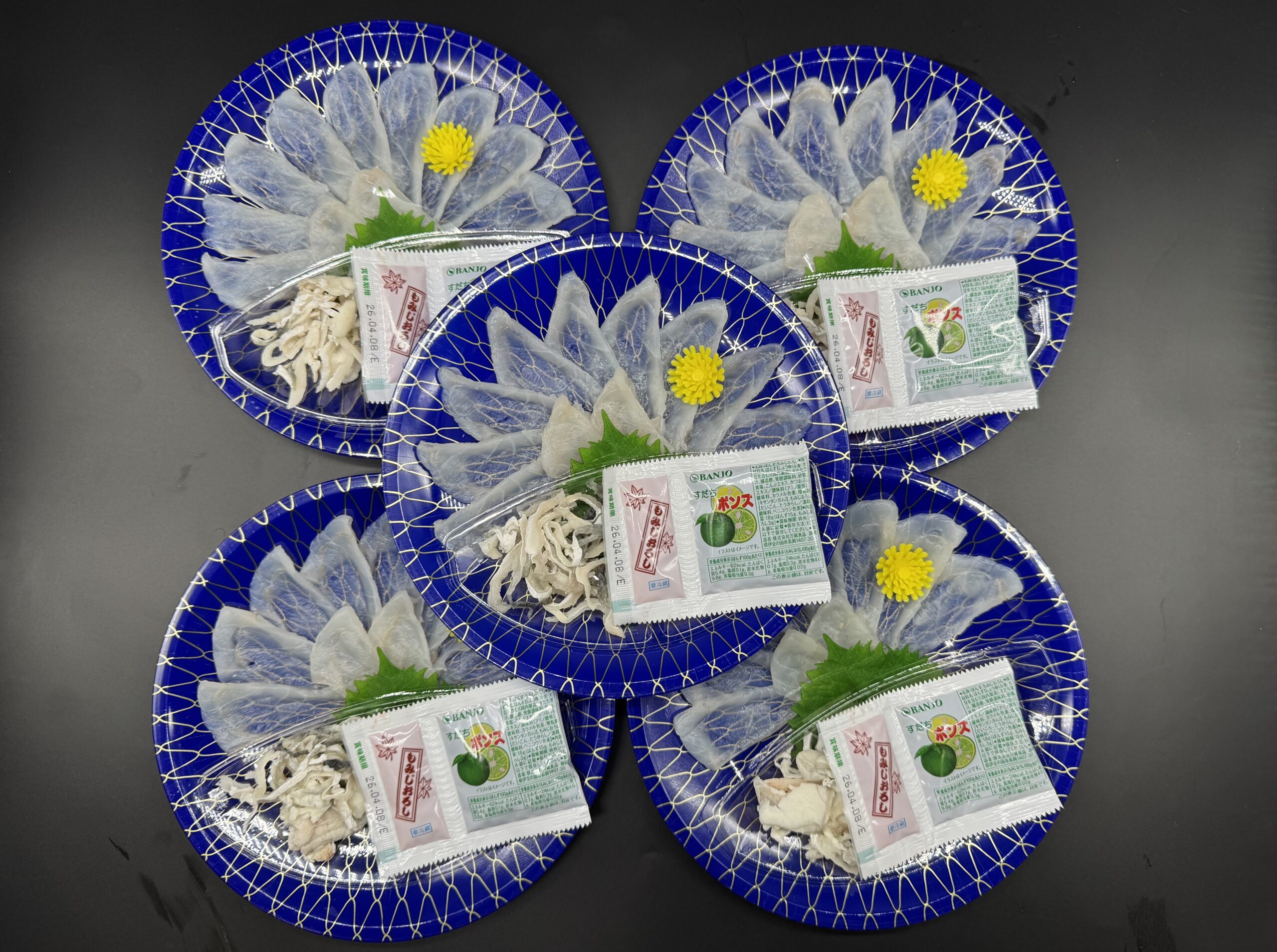 ふぐ刺し25g(ふぐ皮・ぽん酢・もみじおろし付)が5枚になったセットのご案内です。